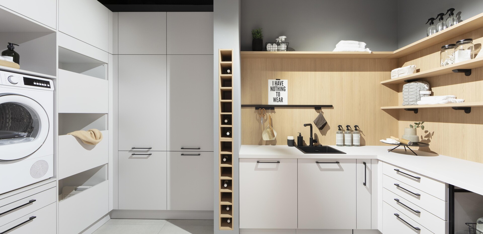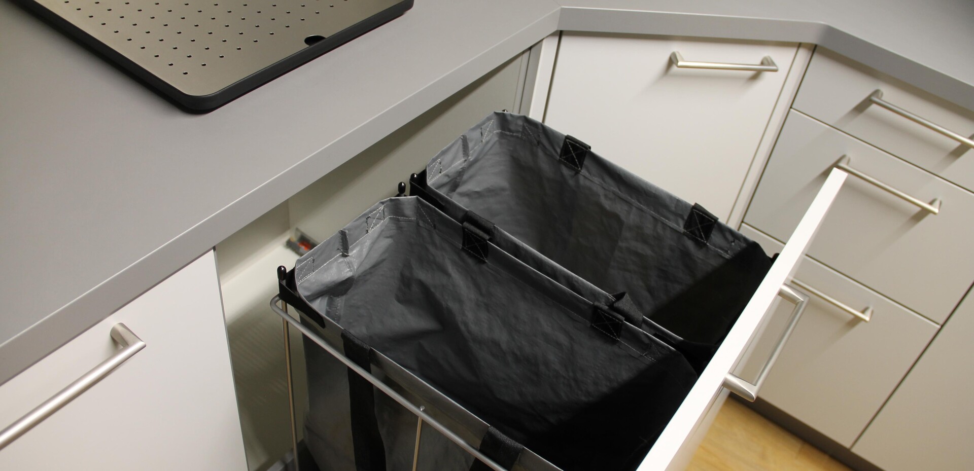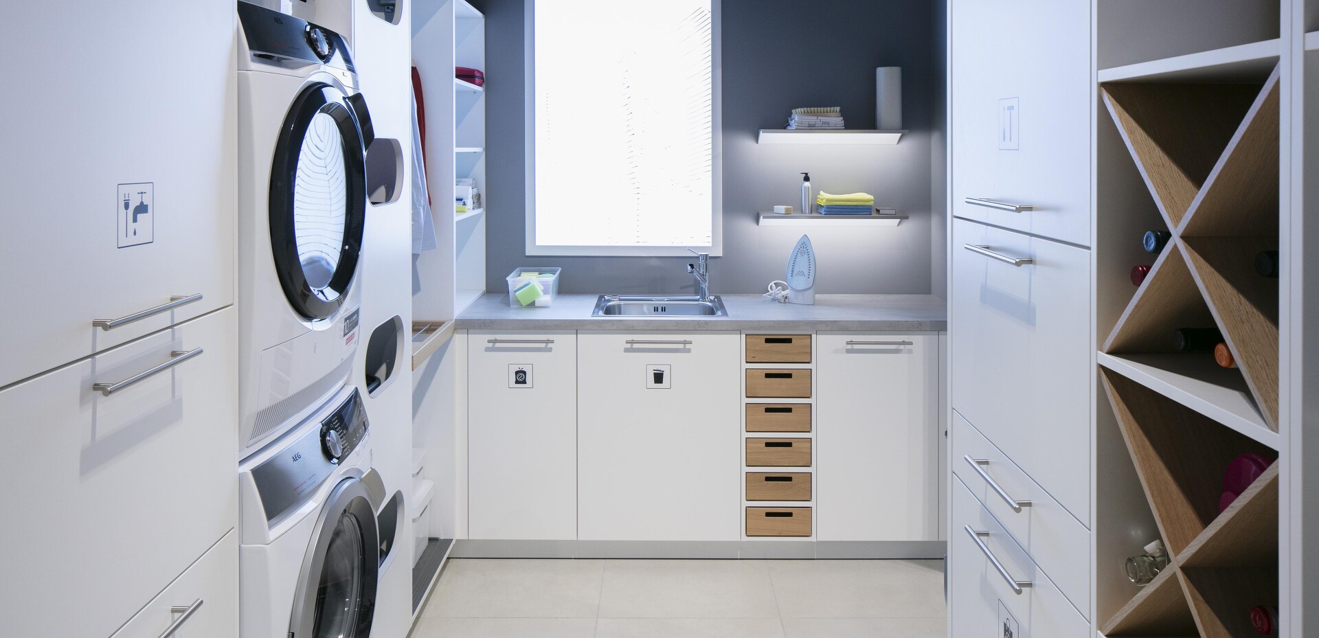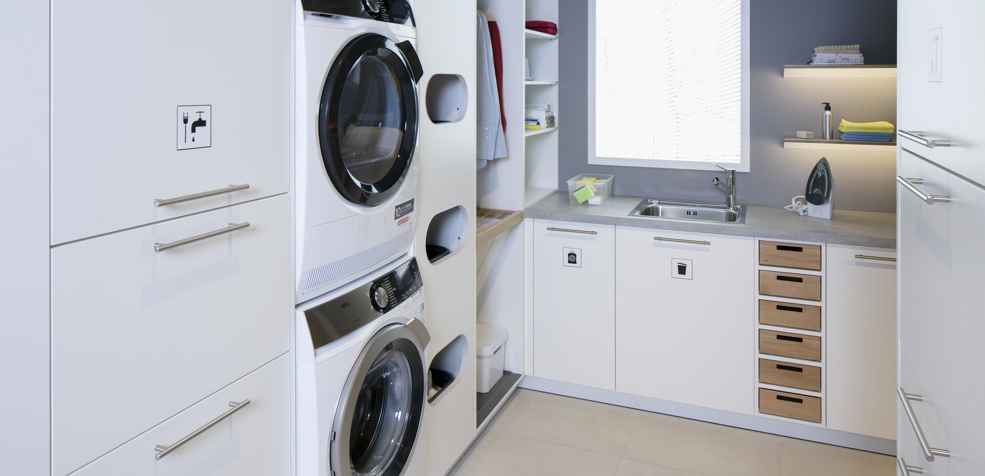 Seit sich die Küche öffnet und immer mehr zentraler Mittelpunkt des Wohnens wird und man oft keinen Keller mehr zur Verfügung hat, stellt sich die Frage: Wohin mit den Dingen, die man täglich braucht, die aber nicht für jeden gleich sichtbar sein sollen? Themen wie Bevorratung, Reinigung & Wäschepflege sowie Recycling werden in diesen individuellen Designlösungen je nach Kundenwunsch berücksichtigt! Sehen Sie selbst!