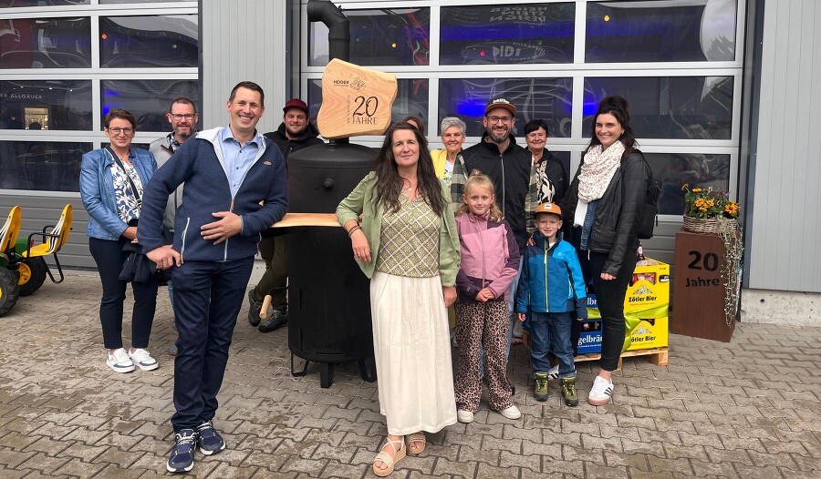 Das Allgäuer Küchenstudio gratulierte der Firma Heider Stein Design, Woringen zum 20jährigen Firmenjubiläum! Das Jubiläum wurde mit einem großen Fest in den Hallen der Firma Heider gefeiert! Als Jubiläumsgeschenk übergab das Allgäuer Küchenstudio einen großen Heizkessel mit einer massiven Theke aus Eschenholz mit Baumkante, gefertigt in unserer hauseigenen Schreinerei. Zur Erinnerung haben wir ein Holzschild mit gelaserten Glückwünschen und Logos montiert.