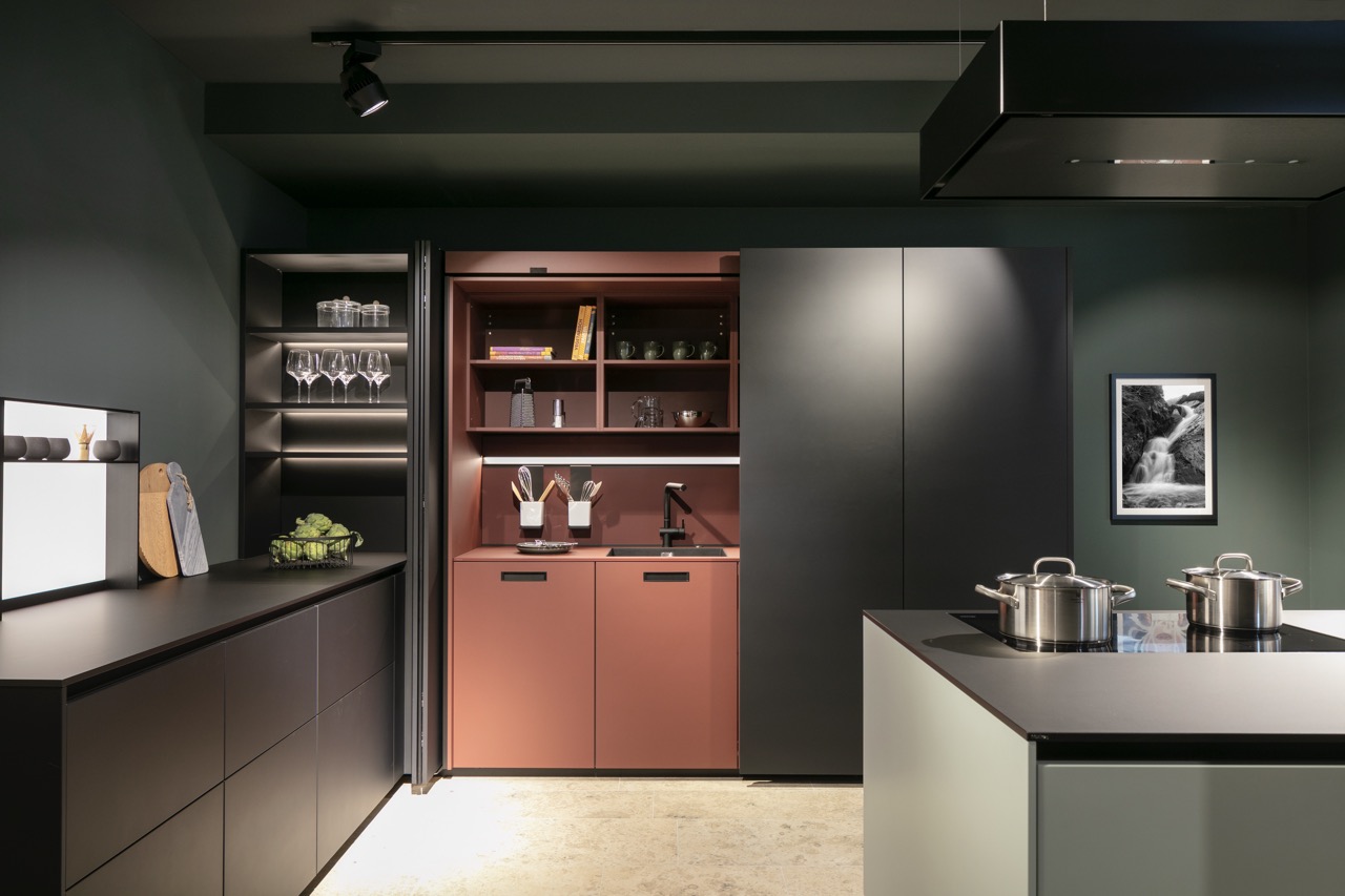 Der Clou: Die Schiebetüren sind zugleich Falttüren, und nicht nur das – sie lassen sich ihrer gesamten Länge nach in einen eigens dafür frei gelassenen Spalt zwischen den Küchenschränken parken. Die Tür ist damit aus dem Bewegungsbereich und die Möbelzeile komplett zugänglich.