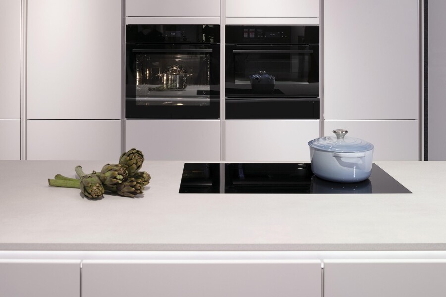 Der Trend zum Schwarz hält an und sorgt dafür, dass auch die Gerätehersteller möglichst viel schwarz gestalten, das früher noch silbern hervorblitzte: Ehemalige Edelstahlelemente werden entweder durch schwarze ersetzt oder weggelassen und kommen mit griffloser Gestaltung aus, bei der sich Gerätetüren durch Antippen oder auf Zuruf öffnen. Letzteres hilft, Fingerabdrücke zu vermeiden, denn gerade wenn die Ausführung in Schwarzglas erfolgt, werden sie störend sichtbar.